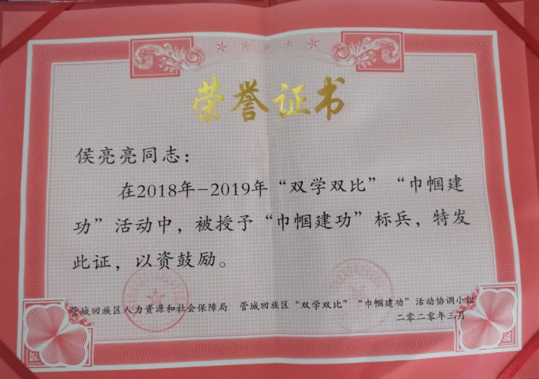金秋九月,捷報頻傳!煥廷法律服務集團侯亮亮律師在2018年—2019年“雙學雙比”、“巾幗建功”活動中,憑借其優異的表現,被鄭州市管城回族區人力資源與社會保障局、管城回族區“雙學雙比”、“巾幗建功”活動協調小組授予“巾幗建功”標兵榮譽稱號。