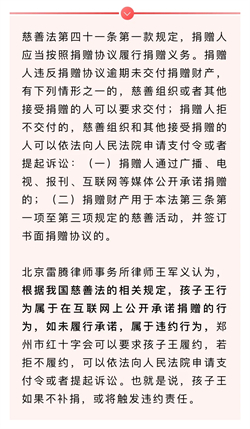 北京市東元律師事務所律師孔磊認為,該虛假行為具有嚴重的道德瑕疵,是一種愛慕虛榮、破壞社會道德風尚的行為。如果其利用該虛假捐款行為,作為自己獲得某種具體經濟收益的一種手段,破壞了社會秩序,可能會涉嫌違法。